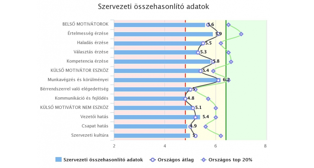 Az alábbi ábra egy adott vállalat diagnózissal lefolytatott felmérése alapján a munkamotivációs faktorokra adott dolgozói értékeléseket mutatja (vízszintes kék oszlopok) hozzámérve az adatokat a felmérésben részt vett szervezetek országos átlagához és az országos top 20%-hoz. Az 1-től 8-ig történő minősítések alapján (1-es az legkevésbé-, 8-as a legelégedettebb) a grafikon görbéi közti távolságok hívják fel a figyelmet azokra a területekre, amelyek az adott vállalatnál fejlesztésre szorulnak (mint például a belső kommunikáció, szervezeti kultúra stb.) hogy az értékelések a jobbak – magasabb motiváltságot és elköteleződést mutató – eredményeihez közelítsenek.