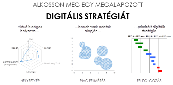 A projekt célja egy olyan megalapozott digitális stratégia, amely integrálja a cég jelenlegi helyzetét és a piaci, technológiai lehetőségeket. Eredményként egy olyan közösen elfogadott és priorizált cselekvési tervet teszünk le, mellyel elérhető a digitalizációban rejlő lehetőségek közel maximuma és egyben maximalizálja a digitalizációs projektekre fordított erőforrások megtérülését.