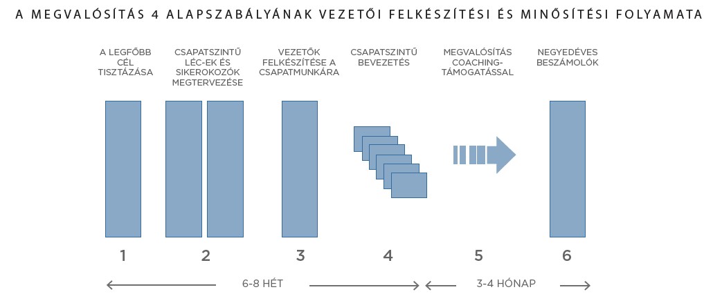 Úgy tudjuk felépíteni a célmegvalósítás kultúráját, ha a szervezetünk kulcsvezetői – a felsővezetőktől kezdve az arcvonalban küzdő csoportvezetőkig – megszerzik A megvalósítás 4 alapszabályához kapcsolódó vezetői minősítést. Ez a következőképpen történik:
